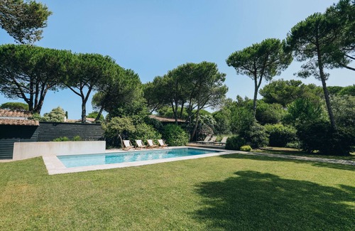 This spacious 205m2 property includes a welcoming dining room with a large table for 12 guests, opening onto a bright living room with a fireplace. Its shaded and sunny terraces offer perfect spaces to relax at any time of the day. The villa is equipped with a modern and well-equipped kitchen, 5 comfortable bedrooms and 4 bathrooms, including 3 with shower and 1 with shower and bathtub. Moreover, a small TV lounge with kitchenette offers additional space for more independence and comfort during your stay.