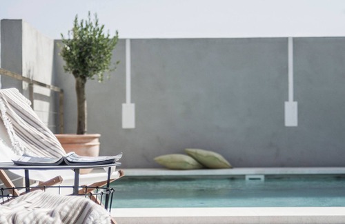 Terrace with private pool, dining table, deck chairs and sea / city views