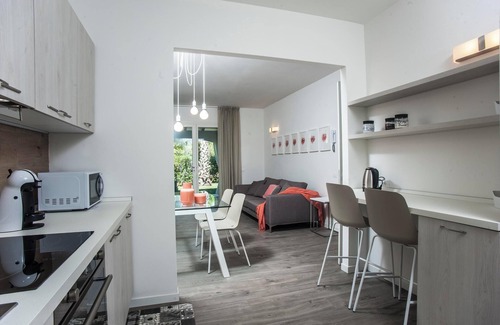 You can enjoy pleasant moments in the private garden and on the covered terrace, where you will find a dining area and a barbecue to enjoy outdoor meals together. The shared property features a beautiful pool with sun loungers and an outdoor shower, ideal for relaxing and cooling off surrounded by palm trees on summer days.