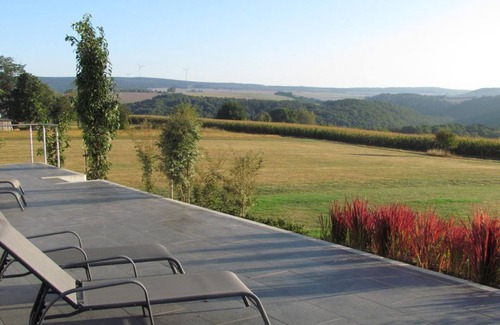 The "Villa Hunsrück" (5 stars classification German Tourist Association) is a well-equipped, very luxurious apartment (160 m²) for 2-6 persons in a very quiet location, with a beautiful view of the Walholztal. Free wifi. Smoking and pets are not allowed in the house.Layout of the apartments: Open kitchen with living and dining room, terrace glazing, 3 double bedrooms, 2 bathrooms (1xwith whirlpool) and separate guest toilet. Large terrace with barbecue, sunbathing area and free parking. In the garden a sauna available which you can book extra.