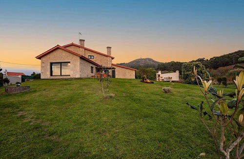 Luxury Singular Villa Carolina boasts stunning mountain views from its balcony, an inviting outdoor swimming pool, and a beautiful garden, all conveniently located near Playa de Seráns and just 2.9 km from Praia de Areas Longas. Offering free private parking, this country house is perfect for those looking to immerse themselves in activities like fishing, canoeing, and billiards. Inside, the villa features a spacious layout including five bedrooms, a cozy living room with a flat-screen TV, and an equipped kitchen with a fridge and dishwasher. With four bathrooms equipped with showers, along with provided towels and bed linen, guests will find all the comforts of home. The terrace offers breathtaking sea views, making it an ideal spot to relax. Family-friendly amenities include a children’s playground, and the property invites guests to engage in table tennis or explore the surrounding area by bicycle. Located on the beachfront of Espiñeirido beach, part of the Corrubedo Natural Beach Park, the villa offers access to pristine landscapes protected for their beauty and ecological importance. The villa's charm extends outdoors with three porches—two facing the sea and one the mountains. The pool area features comfortable hammocks and Balinese beds, perfect for unwinding at sunset. A games room with billiards and a barbecue area, complete with a large gazebo lit by twinkling lights, creates a magical atmosphere for gatherings. Luxury Singular Villa Carolina is the perfect destination for holidays filled with sun, beach, nature, water sports, and local cuisine, anytime of the year.