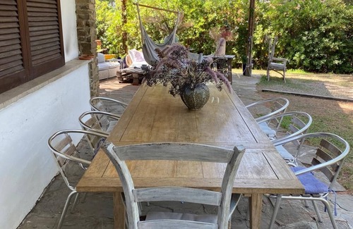 The villa is composed as follows: large living room, veranda dining room, peninsula kitchen, No. 4 bedrooms plus a study room with a sofa bed for a total of 12 beds, 3 bathrooms including one "for guests" in the entrance. It is surrounded by zoned garden (large rectangular table for lunch/breakfast, outdoor kitchen with stove and two tables, sofa area, hammocks). The wildlife is varied, there are numerous species of birds, from herons to jays and hoopoes that feed directly on the lawn in the garden.
