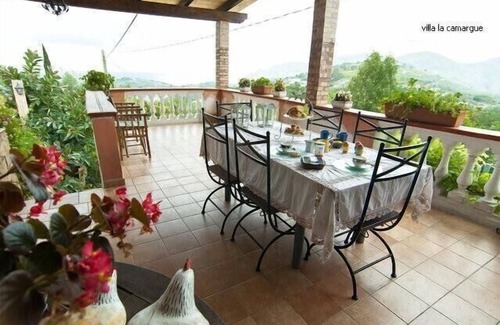 'A stone's throw from sperlonga, on the hills of gaeta, far from the noise of traffic, surrounded by greenery among olive groves, cypresses and aromatic herbs stands Villa la Camargue. in the garden surrounding the house, guests can entertain themselves, have an aperitif, relax in the company of a good book or simply lie down and sunbathe. the panorama is breathtaking: the sea, the aurunci mountains, the circeo promontory, terracina and the beautiful pontine islands. a stretch of 10 km of coast between Gaeta and Sperlonga, among the most beautiful of the Italian peninsula, crossed by a coast road of great charm, which connects the seven beaches that Gaeta offers to its guests. the seven beaches are separated by rocky peaks, each characterized by a Genoese tower. up to the splendid cliffs of Monte Orlando and Montagna Spaccata. Serapo beach, Fontania beach, 40 Remi beach, Ariana beach, Arenauta beach, San Vito beach and Sant'Agostino beach. and then ..... the beach of Sperlonga, Capovento, Bazzano, Punta dello Scarpone and Punta Cetarola. The villa, recently renovated, is on two levels: 5 bedrooms, large living room with fireplace, open kitchen, 2 large bathrooms, one with two bathrooms, patio, terrace equipped with outdoor kitchen and barbecue, garden. It is possible to organize events to spend birthdays, graduation parties or new years with your friends