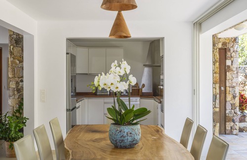Set in a rocky, unspoilt environment, it offers a peaceful, rejuvenating atmosphere. The living room opens onto the terrace overlooking the ocean. The dining room can accommodate up to eight guests, and the kitchen is fully equipped. You can have dinner either indoors or outdoors on the covered terrace.