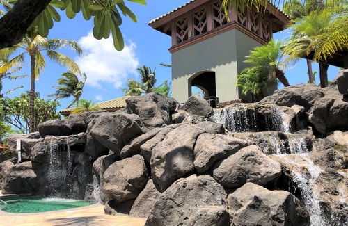 Resort style swimming pool, Keiki pool, and hot tub with natural lava rock waterfalls!