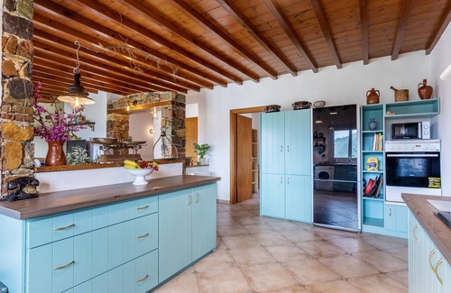 On the ground floor of the house you will find a large fully equipped kitchen with gas cook top, electric oven. Washing machine. Big country stile dining room table, living room with 5 seat corner sofa, which here can be made up for a fifth person to sleep. Remote controlled ceiling fan, Smart tv and cable with Greek and English channels. A reading nook with spectacular view. A large bedroom with air-condition, dark curtains and bathroom with large shower. A separate office with good workplace. On the second floor you will find the second bedroom with a double bed, air condition, darkening curtains and balcony access. The second bathroom with shower, and the gym. Mosquito net in all windows and doors.