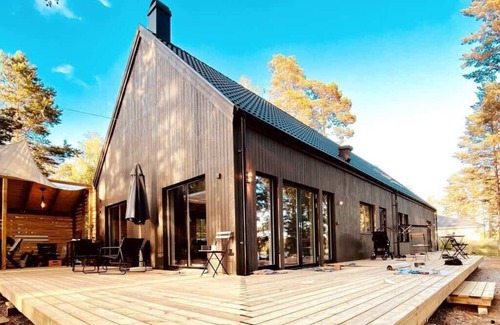 The villa is a new construction in a very unique location, directly on the lake. The headland (Nabben) with the blueberry garden and your own sauna is your very private retreat for your time. The house has a large kitchen with plenty of space to cook together. The living room with fireplace and 6 meter high ceiling invites you to let the evenings fade away. The entire length of the house towards the lake is placed the 20 meter wide terrace with outdoor kitchen. The spacious bathroom on the first floor with bathtub and shower give next to the bathroom upstairs enough space to get out of the way in the morning. Two bedrooms are also downstairs with patio doors onto the terrace facing the lake. Upstairs are three more bedrooms for nighttime retreats.