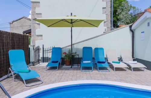 Beautiful terraced house "Villa Nicolara", 2 storeys. In the hamlet Krušvari 9 km from the centre of Buzet, in a sunny position, 45 km from the sea. Private: property 200 m2, garden with lawn, swimming pool (15 m2, depth 150 cm, seasonal availability: 01.May. - 15.Sep.). Outdoor shower, terrace (20 m2), garden furniture, barbecue, pool maintenance by the owner/gardener. In the house: internet access, washing machine. Parking (for 2 cars) at the house on the premises. Shop 9 km, supermarket 9 km, restaurant 1.5 km, bus stop 9.5 km, pebble beach 45 km, rocky beach 45 km. Walking paths from the house 100 m, cycle lane 150 m. Nearby attractions: Nature park Učka 18 km. The owner does not accept any youth groups.