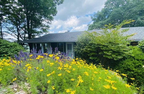 Ensconced in an oasis of sophisticated style, sip your coffee in the morning in the Sun Room, gazing at a long range view of the Blue Ridge Mountains in North Carolina and the Smoky Mountains in Tennessee, sixty miles away. In the evening, cook a luscious meal in our fully stocked galley kitchen, or on the gas barbie outside on the Sky Deck, then dine at our vintage Danish table, or out on our ultra-comfy chaise lounges on the porch. Toast your loved ones with a glass of wine as the sun goes down and night blankets Villa Nirvana, then marvel at the magical view of Hendersonville, sparkling like a jewel of lights in the distance.