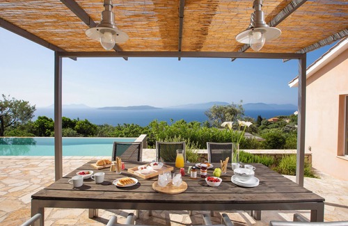Perched on Akropsias Hill, Villa NISI (meaning "island" in Greek) enjoys panoramic views of the Ionian Sea and the islands of Ithaca and Kefalonia. South-facing, the villa is filled with natural light throughout the day and stays pleasantly cool thanks to sea breezes. Air conditioning is available in all main indoor living areas for extra comfort.