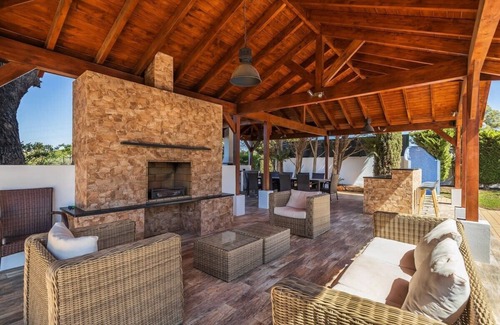 Outside, there is a pool with jacuzzi attached. Surrounding the pool area there are sun beds for guests who want to enjoy the Portuguese sun. There is also a beautiful covered outdoor area with built in barbecue, outdoor sofas, alfresco dining furniture, and outdoor countertops.