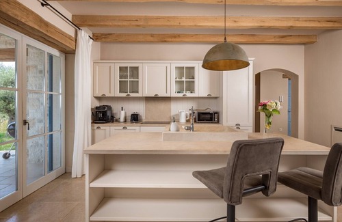 On the ground floor of the house there is a fully equipped kitchen, living room with a sofa and a fireplace and separate dining room. There is also a separate toilet, utility room with washingmachine and a bedroom with double bed and a private bathroom. On the first floor of this beautiful villa, there are three bedrooms with double bed, each with its own bathroom, and one with access to a spacious balcony with new furniture and panoramic sea view and olive grow view. The villa has a cooling and heating system which constantly can give you a perfect temperature of the villa. All Bathrooms have showers.