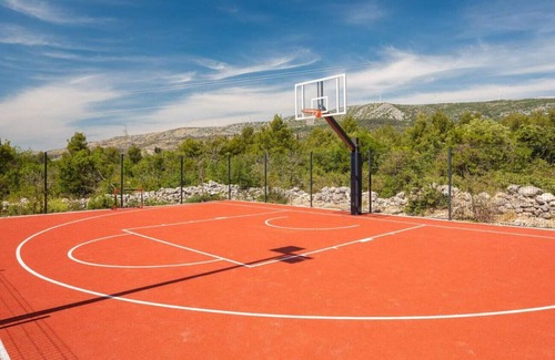 Nestled in the tranquil rural area of Dubrava kod Šibenika, this modern and comfortable property offers a truly exceptional holiday experience. With a private plot spanning an impressive 6,000 square meters, this accommodation provides ample space for guests to relax and unwind.The property boasts a range of impressive amenities, including a private tennis court, basketball court, game room, darts, children's area, gym, sauna, and a heated swimming pool measuring 8 x 5 meters. Inside, the accommodation features 6 spacious bedrooms, each with a luxurious king-size bed, and 6 bathrooms, 3 with showers and 2 with bathtubs. The property is equipped with air conditioning throughout, ensuring a comfortable temperature year-round.The kitchen is well-equipped, featuring a gas stove, fridge, freezer, washing machine, dryer, coffee machine, oven, dishwasher, microwave, and a full set of kitchenware. Guests can enjoy meals together in the American-style kitchen or al fresco on the terrace, which offers stunning views of the pool and garden.The property also offers a range of entertainment options, including table tennis, foosball, an outdoor fireplace, and a strongbox for secure storage. The living area features a cozy fireplace, DVD player, and 3 TVs with satellite channels in English and German.Surrounded by a lush garden and fenced plot, this accommodation provides a peaceful and private retreat. The nearest sand and rock beaches are just 11 kilometers away in Brodarica, while the historic town of Šibenik, with its charming old town and bustling cafes, is only 7 kilometers away. The Krka National Park, with its stunning waterfalls, is also within easy reach, just 11 kilometers from the property.For those seeking a truly exceptional holiday experience, this property offers the perfect blend of modern amenities, outdoor activities, and stunning natural surroundings.Damage deposit of 1000 EUR will be charged from the guests in cash upon arrival. It will be returned upon departure if everything is in order. Smoking is allowed outside. Pets are allowed upon request only. 2 baby cots and 1 highchair are available upon request.