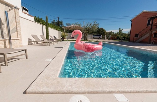 Villa Rosa with private pool and 5 bedrooms can accommodate 10 persons. This beautiful villa with fenced and beautifully landscaped yard and private pool (50 m2) is located near the town of Umag and 3 km from Kanegra beach. On the ground floor there is a fully equipped kitchen with dining area, a living room and two bathrooms. On the first floor of the house there are 4 bedrooms and one bathroom. Two bedrooms have a balcony, with a view of the sea. Outside stairs lead to a secluded apartment with a kitchenette, a bedroom and a bathroom. Bed linen, towels, Wi-Fi and Sat-TV are provided and included in the rental price. In the beautifully landscaped garden guests have at their disposal: a swimming pool, deck chairs, an outdoor shower, private parking, garden seating furniture and a grill. Come to this beautiful villa and enjoy a wonderful vacation with your friends and family!