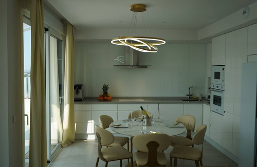 3 floors, ground floor: open-plan kitchen with all appliances (thermomix, coffee machine, fridge-freezer, oven, washer-dryer, etc.) and accessories, living room with sofa bed, 85-channel TV (Polish channels), bathroom with shower, and a bedroom for 2 with access to the garden. First floor - large bedroom with a view of the sea, king-size bed, dressing table, 75-channel TV (Polish TV), private bathroom with shower, second bedroom with a sea view, with a private bathroom, 55-channel TV (Polish channels). Inductive phone chargers are installed in each bedroom. Directly from the first floor there is access to the first observation deck (2 comfortable armchairs and an avocado tree). The third floor is a beautiful observation deck - on one side there is a view of the sea and the panorama of Alicante and El Campelo, on the other side there is a view of the mountains and golf courses.On the viewing terrace, you'll find a gas grill with a rotating spit, a refrigerator, a lounge set for 8 people, and a deckchair.