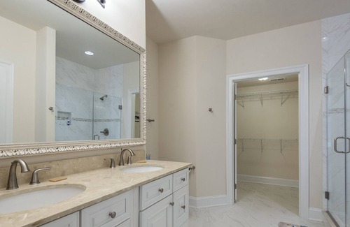 Beautifully appointed end unit villa with pond view in one of NV Homes newest community, The Overlook. Built in May 2017, the villa boasts three bedrooms with a first-floor master suite (two queen and two twin beds) and 2.5 baths with approximately 2200 sq ft of living space with hardwood floors throughout. Two 50" (1 - Smart LED HDTV and 1 - 4K Smart LED Home Theater Display) and one 55" (Smart LED HDTV).