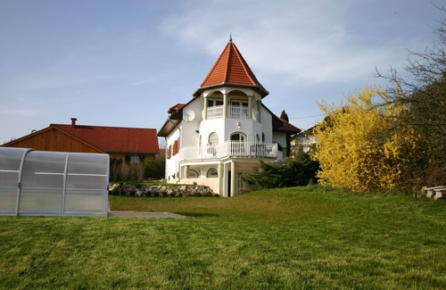 Our exclusive holiday home in Cserszegtomaj with panoramic views of the spa town of Heviz, Lake Balaton (Balaton) and Keszthely. The house is located on the outskirts of Cserszegtomaj (Spa Heviz), below the forest in a quiet and best-facing hillside, on the edge of the National Park. The house has 3 levels, each level has bedroom, kitchen, bathroom, living room and dining room, terrace or balcony. A huge area of about 4000.00 square meters. The indoor pool 9,30 mx 3,50 mx 1,40 m can be used from mid-March to late October. Covered terrace by the pool and barbecue. Each level is equipped with television on, stereo with USB, WLAN.