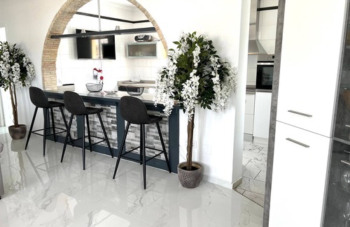 It boasts a spacious and modern living room with a comfortable sofa, TV, fireplace, and large windows that allow plenty of natural light to fill the space. The dining area, with seating for six, is integrated into the living room, allowing you to enjoy meals without missing out on the company of friends and family. The fully equipped kitchen features all modern appliances for a comfortable stay and is seamlessly connected to the living space through an arched opening with a small breakfast bar and high stools, complementing the décor and comfort.