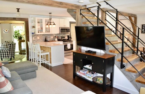 You won’t be disappointed. This special 3BR/3bath (sleeps 8-10) home sitting on the Mad River in Warren Vermont, has fabulous views of the river and covered bridge. Open the windows and hear the waterfall all day or night. Located directly on the river, steps from the center of Warren Village, this newly renovated adorable house has a new kitchen, new floors, painting, and linens.