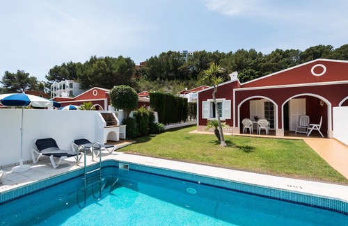 A colourful, small complex of semi-detached villas, each one with their own private swimming pool and surrounded by a small garden. The villas consist of three bedrooms; two twins and one double, all with fitted wardrobes. There are two complete bathrooms; one of which is en-suite. The living/dining area is fully furnished with sofas, dining table and chairs, television with tdt, dvd and satellite (with limited English channels). The kitchen is fully equipped with dishwasher, oven, electric hob, microwave, fridge/freezer and all the necessary kitchen utensils, crockery and cutlery. From the living/dining area there is access to the furnished terrace where you will find the private swimming pool and built-in bar-b-q. The villas also have air conditioning. Pool and Garden shape and size do vary Please note there is a Eco-Tax on this property of 2.20€ per night per person over 16 Nearest beach: 0.8 kms Nearest bar / restaurant: 0.3 kms Nearest supermarket: 0.5 kms