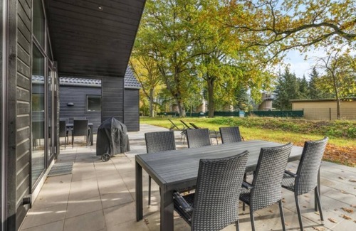 This text describes a spacious VillaVilla luxury holiday home in Krakow am See, Mecklenburg-Western Pomerania, that can host up to 12 guests. The home is located in a newly developed holiday area by the Krakower See, offering various activities for year-round enjoyment. The house features a swimming pool with a water slide, Roman steps, and a counter-current system, as well as a whirlpool and sauna for relaxation. An activity room with billiards, table tennis, darts, and table football is available for entertainment. The home has five double bedrooms, a converted loft, and two bathrooms. The living area includes a lounge with a dining table, a TV corner, and a fully equipped kitchen. Outdoor amenities include garden furniture, a partly covered terrace, and a barbecue. Guests over 16 are required to pay a tourist tax, which varies depending on the season.