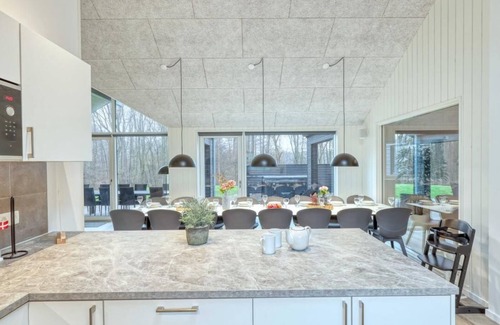Welcome to this fantastic activity-packed house at Trams am See, accommodating up to 16 people. Located in a quiet and scenic area of northern Germany by the lake, it offers the perfect setting for a relaxing holiday away from everyday stress. The spacious open-plan kitchen and living area welcome you as you enter, featuring a well-equipped kitchen and a long dining table that seats everyone. This setup is ideal for enjoying meals and quality conversations together. The large activity room provides various games such as billiards, table tennis, table football, and darts, perfect for setting up family tournaments. After the competitions, you can relax with a drink from the activity room bar, bringing along your favorite mixers. For more fun, the private pool area includes a swimming pool with a water slide, ensuring hours of enjoyment for both children and adults.\r\nWhen you need to recharge, head to the large outdoor terrace equipped with a whirlpool, sauna, and shower, offering a tranquil place to relax. \r\nThe outdoor area also caters to younger guests with a swing set, trampoline, and play tower. The house features two sleeping areas, each with three bedrooms, ideal for large families or groups of friends. Additionally, there are four beds in the two lofts, popular with kids and teens.