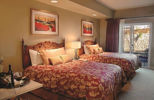 Vino Bello's luxurious units are designed with a romantic Tuscan theme. Its warm colors and rich fabrics bring out the essence of the Napa Valley. The fully equipped and custom designed kitchens feature an upscale appliance package and granite counters. Local Napa artisans' work is highlighted throughout the resort. All of the furniture has been custom made for Vino Bello, with hand carved wood treatment throughout the units. The studio unit features a kitchenette, a 27" LCD TV, and two double beds. All guests are subject to the Transient Occupancy Tax of $5.00 per day that will be collected at the resort. Free daily shuttle to and from downtown Napa and BOTTLE ROCK! Stay 3 nights and 4th night free. Stay an addition 3 nights for a deep discount!