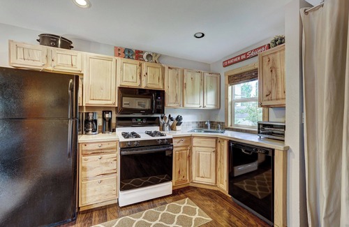 This 2-bedroom plus loft cabin comfortably sleeps up to 6 guests, with all bedrooms located on the second floor—perfect for restful nights or late-night relaxation away from the main living area. Enjoy the convenience of your own washer and dryer, and gather in the bright great room featuring an open living space, kitchen, dining for four, a large TV, and a warm electric fireplace.