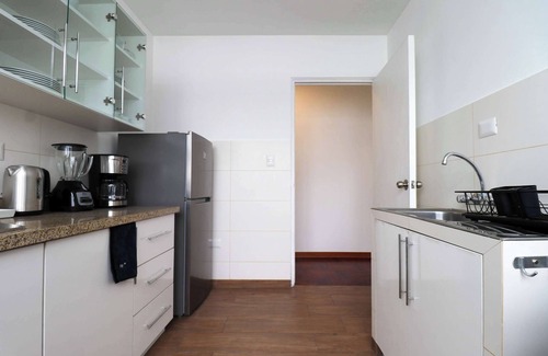 In the welcoming Miraflores neighborhood, this beautiful apartment it's very well located; just minutes away from Larcomar shopping center, Parque Kennedy, Virgen de Fatima Parish, and exclusive gyms. The area has currency exchange services, and labs centers in case you need to take a test, such as ROE and Multilab.