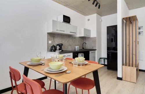Stylish Poznan apartment, located on the 1st floor, offers accommodation for 4 people. It is an excellent choice for demanding guests - here a great standard of finish goes hand in hand with functionality. The apartment area consists of a living room with a kitchenette, a separate bedroom with a comfortable double bed and a bathroom with a shower. The tasteful color scheme of the interior, with fashionable design accents, as well as modern furnishings, provide the apartment with an unusual yet cozy atmosphere. The living room has access to a balcony with a relaxation area, so you can greet the day with a cup of coffee in the fresh air! Multimedia equipment in the apartment includes a modern TV and high-speed Wi-Fi connection. Located in the living area, a large dining table will allow guests to enjoy meals together. The comfort of the stay will undoubtedly also be influenced by quality household appliances, such as a washing machine, microwave oven and dishwasher. The apartment is stocked with all the basics necessary for relaxation. To facilitate the start of each stay, a complimentary set of toiletries (soap, shampoo and shower gel), towels and linens are provided. The apartment comes with a private parking space in an outdoor parking lot, which is a great advantage for those traveling by car.