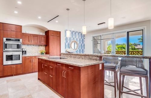 The expansive covered lanai rounds out this exceptional residence. This outdoor entertaining option features comfortable lounge seating and a Viking barbeque gas grill. Whether you want to sip your morning coffee and enjoy the views or dine alfresco while grilling, you’re sure to feel right at home. Take advantage of the close proximity to the family pool, fitness center and quick walking distance to Wailea Beach.