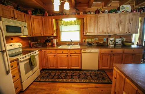 West Jefferson, NC - Want to be assured of a restful vacation? This log cabin, privately situated only three miles from West Jefferson, is just the place to stay. Whether you're looking for a quiet romantic weekend, or a week-long family vacation, you'll enjoy the comfort and modern amenities of this log home. There are wonderful mountain views to enjoy from the rocking chairs on the oversized porch or the bubbling hot tub. Inside, in air-conditioned comfort, the main level offers a large great room with plush furniture, a cozy gas fireplace, 42 Plasma HDTV with premium satellite channels including Starz and movie channels, a dining and kitchen area with lots of windows for enjoying those wonderful mountain views, along with a nice-sized bedroom with king bed and hall bath. Hardwood floors lead up to the loft area, nicely furnished as a sitting/sleeping area and shelves stocked with many bestseller books. The huge master bedroom provides a comfy king bed, satellite TV & its own private bath and walk-in closet. Have additional guests or children? The downstairs area provides another bedroom with two sets of bunks and a daybed that makes two twins, along with a third full bath. Tired of eating out? Throw a steak on the charcoal grill and enjoy the evening nestling by the fire or rocking on the porch! Now that's relaxing. Or, if you prefer, make a quick trip into West Jefferson, and eat out at one of our fine restaurants, shop the downtown area with its quaint shops and art galleries, or spend about 25 minutes driving into Boone, Blowing Rock, or to the ski slopes. Well-behaved dogs are welcome, and a fenced area with Dog Run is provided. Sorry, no cats. Towels & Linens are provided along with a washer/dryer. Wireless DSL access and fax machine is now available, as well as Pool table, Pub table and chairs, and 2 additional TV's (total of 4) have just been added to increase your enjoyment of this cabin.