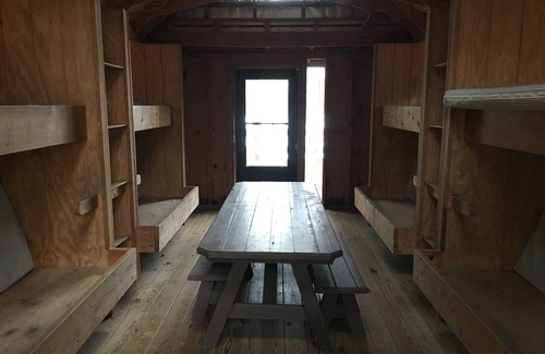 Wald boasts 3 - 8 person cabins with bunk beds. Each cabin has electric and picnic table. You will have access to an outdoor kitchen complete with gas range and refrigerator, 3 compartment sink, pavilion with electricity and fire ring. There is a bathroom with multiple stalls nearby with electric and flush toilets. This unit is at the back of the lake. Wake up in the morning to the sound of geese and fall asleep to the sound of bullfrogs.