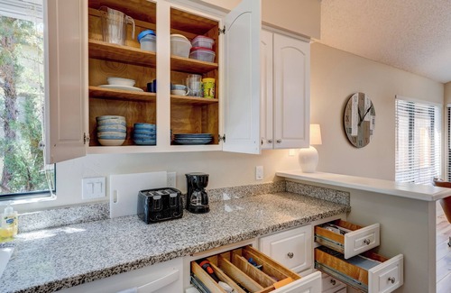 Home is stocked with linens, blankets, towels, starter bathroom toiletries, hangars, laundry baskets, unscented laundry detergent, fans, kitchenware, pots/pans, condiments, cleaning supplies, and trail maps.