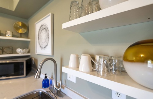 Fully furnished kitchen with apartment sized refrigerator, stove, microwave, spices, cookware and complimentary coffee