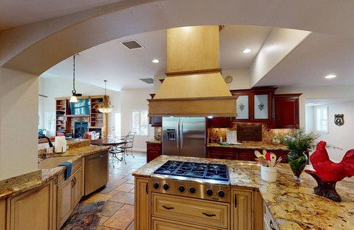 For Groups that want need additional private rooms we can offer our Guest Home located over our 4 garage workshop/garage. The Guest Home close to 1500 sqft and sleeps a 4 additional people Max. The Guest Home is an additional charge if adding to the Main House Stay. It is accessed thru the workshop and upstairs. It is very well appointed with fully equipped kitchen with freezer, fridge, cooktop/oven, and microwave. There is seating at the granite counter top for 2, table for 2 and then a living room area with a love seat & 2 chairs & TV. There is 2 bedrooms. The 1st bedroom has a twin size bed and we also have an additional twin size bed that is a roll out folding bed. This room also has a small office nook. You do pass thru bedroom #1 to enter into Bedroom #2 which is the Master Suite. The Master Suite of the Guest House does have a Cal King Bed with TV. The Guest can sleep 2 people comfortably. All the furnishings, beds, linens, and accessories are brand new! If you are renting the Main House and include the Guest House with your stay then the Guest House does have full pool privileges. If choose to only rent the Main House then only the Main House has the pool/spa privileges. FOR ADDITIONAL ACCOMMODATIONS, PLEASE REFER TO VRBO# 740547 FOR PICTURES & MORE INFORMATION ON THE GUEST HOME AMENITIES. THE GUEST HOUSE MAY BE RENTED OUT CONCURRENTLY - SUBJECT TO AVAILABILITY. Please inquire for pricing to add the Guest Home into your stay. Prices quote here are only for the main estate.