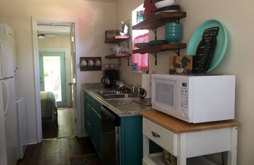 Come and enjoy Amarillo Casita on the shores of Cypress Creek. The location is just a short 1.5 miles to downtown Wimberley, yet is a world of its own. Swimming, fishing or just floating in the cool waters of the spring fed creek takes away all stresses and worries, and the comfortable and fully equipped cottage offers all the creature comforts you desire. There are 2 bedrooms, a queen and king size bed, one bath and a fully equipped kitchen. Enjoy a morning cup of coffee on the back deck or sit in the adirondack chairs by the creek. Dinner is best enjoyed on the deck overlooking the creek. Romance is in the air. Come and see the magic of Wimberley and Cypress Creek.