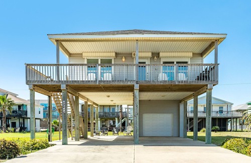 Water-view home steps from the beach - central AC, washer/dryer, & shared pool | House in Galveston