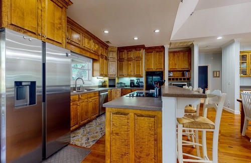 The well-equipped kitchen is an entertainer's dream - featuring many new appliances, double ovens, a dedicated beverage fridge, a butler's pantry stocked with glassware, an outdoor stainless steel countertop, and a sink located next to the BBQ grill, ample dining space for large groups both indoors and on the elevated patio. Kids will appreciate the thoughtful amenities like a kids' room with bunk beds, a play area, and a spacious outdoor shower for easy cleanup after beach days. One of the queen bedrooms and its full bathroom is accessible via a separate entrance located under the main house level (not from inside the home).