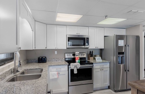 The condo is stocked with Bed linens, bath towels, wash clothes, kitchen towels, a couple of garbage bags and starter toilet paper, starter paper towels and courtesy soaps (you restock these items for your group during your stay). The kitchen is stocked with the essential pots and cooking pans, toaster, coffee pot, dishwasher, microwave, stove and fridge.