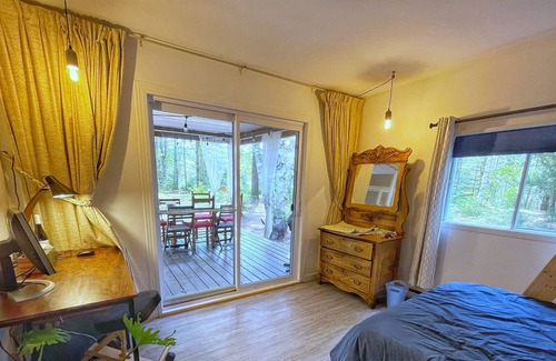 3 closed bedrooms: 2 double beds and 3 twin bunked bed for a total of 7. One sofa bed (futon - double) and one sofa bed in the living room that sleeps 1 for a total of 10. Ample baby gear and children toys as well. Beautiful patio with curtains to enjoy a nice dinner. Bring your own wood. 2 kayaks and 2 paddleboards at your disposal as well as various life jacket sizes.