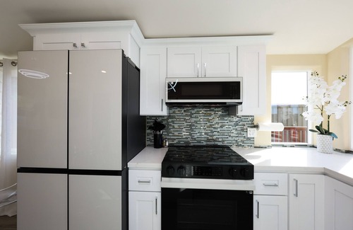 The quartz island and counter tops, new appliances, and well-equipped kitchen has everything you need to cook and dine in, with cookware, a rice cooker, and wine glasses ready for your favorite meals and moments. Plus, you’ll have a washer and dryer to keep things easy during longer stays.