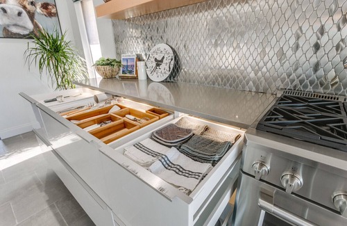 Custom built chefβs kitchen with stainless steel appliances. Drawers are fully equipped with kitchen gadgets and utensils for guests to cook and serve up the most delicious meals! The kitchen island seats six comfortably in addition to the dining room (seats up to 6). Other appliances provided include: blender, hot water kettle, air fryer, toaster