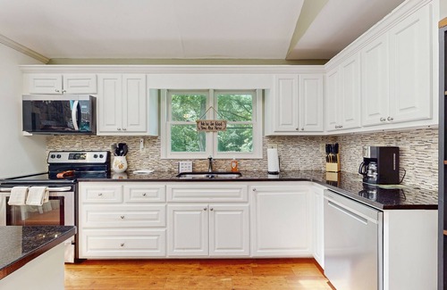 Drop your bags in the expansive, open-concept living area to unwind beneath vaulted ceilings with a nice glass of wine.The deck is enormous and great for hosting get-togethers with friends and family. There's also a large flat yard with easy access to the creek, plenty of room for family games outside, and a screened-in gazebo and two benches where you and your loved ones can enjoy the sights and sounds of nature. But tonight, select a movie from the DVD library to enjoy with lots of salty snacks, courtesy of the full kitchen.