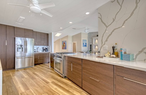 Newly designed gourmet kitchen with total waterfront views and pool.