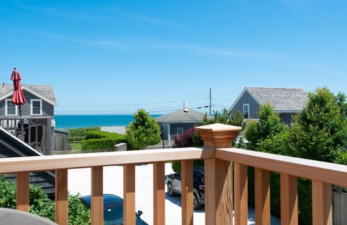 Welcome to Sea Suite~ Dreamy beach cottage in Sconset with views of the sea. Located on the corner of North Gully and Bank Street this darling gem awaits you. Fully renovated top to bottom and inside out this cottage lives like a luxurious hotel suite. First floor features light filled open living with a bright & airy custom eat-in island kitchen with fullsize fridge, dishwasher, and gas range. French sliders open to your private hedged in deck with gas grill, dining table with umbrella and lounge chairs to soak in the sun. Sleeper sofa on the first floor perfect for overflow. Second floor bedroom with king bed, his and hers closet, washer & dryer, and balcony with an ocean view to enjoy your morning coffee or an afternoon cocktail. One off-street parallel parking spot. Enjoy a short jaunt to the beach, year-round wave shuttle bus, playground, village or one of the local restaurants that Sconset has to offer.