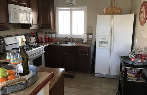 The casita is 860 sq. ft. and is beautifully furnished with a living room, dining room and fully equipped kitchen ready to prepare your favorite meals. The two bedrooms include one king size bed and one double bed. Both include comfortable memory foam mattresses and beautiful linens. There is a washer, dryer, iron and ironing board. There is one full bathroom with amenities.