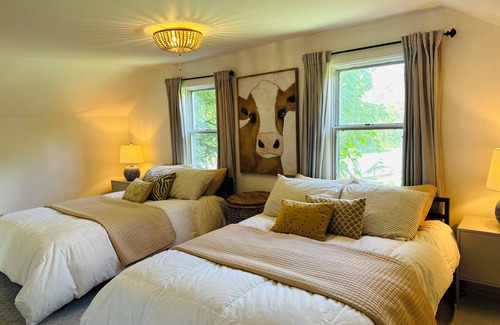 Get ready to enjoy the quaint and peaceful vibes our home has to offer. A place where the timeless charm of our 100-year-old home meets modern polish in every lovingly restored detail. Tucked away on 2 acres, this revamped 3-bedroom farmhouse is your perfect getaway. Located within a 15-minute drive you can experience the many great restaurants, picturesque parks, beaches, antique shops, breweries and wineries. Upon returning home, relax and unwind in one of the three outdoor spaces complete with a 10 person table for a large family dinner, porch off the kitchen for a BBQ cookout, marshmallow roasting by the firepit or just lounging as you watch the sunset over the trees. Let your pets explore the freedom of the large yard dotted with a grassy lawn and a beautiful floral garden, while you lounge in comfort on a cushioned chair in the veranda.