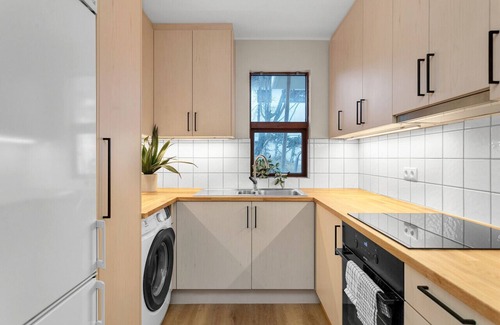 The apartment features a full bathroom stocked with fresh towels and essential toiletries, so you don't have to worry about bringing your own.