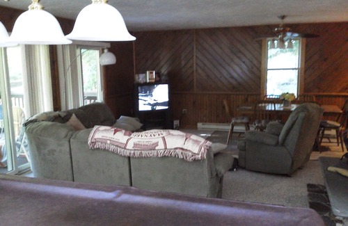 Driveway side entry, upon opening the door you will view the beautiful woodwork and wainscoting , Stone chimney and pool table on your left, as you walk towards the Kitchen straight ahead you will come to the hallway on your right that leads to the first floor wainscoted carpeted bedroom. very comfy and warm. continuing past and towards back door the first floor full bathroom with tub/shower and laundry closet. The stairs leading up is as you first entered and the top you can proceed straight into spacious bathroom or take a right into large carpeted room with 5 single beds fanlight. If you take a right you will walk along beautiful would railing ,Stone chimney overlooking pool table and then entering on the right, the master bedroom, with it's own open porch and bathroom access. This roomy space has a double bed, a beautiful floor to ceiling brick fireplace (not to be used) with slopped wooded ceiling.